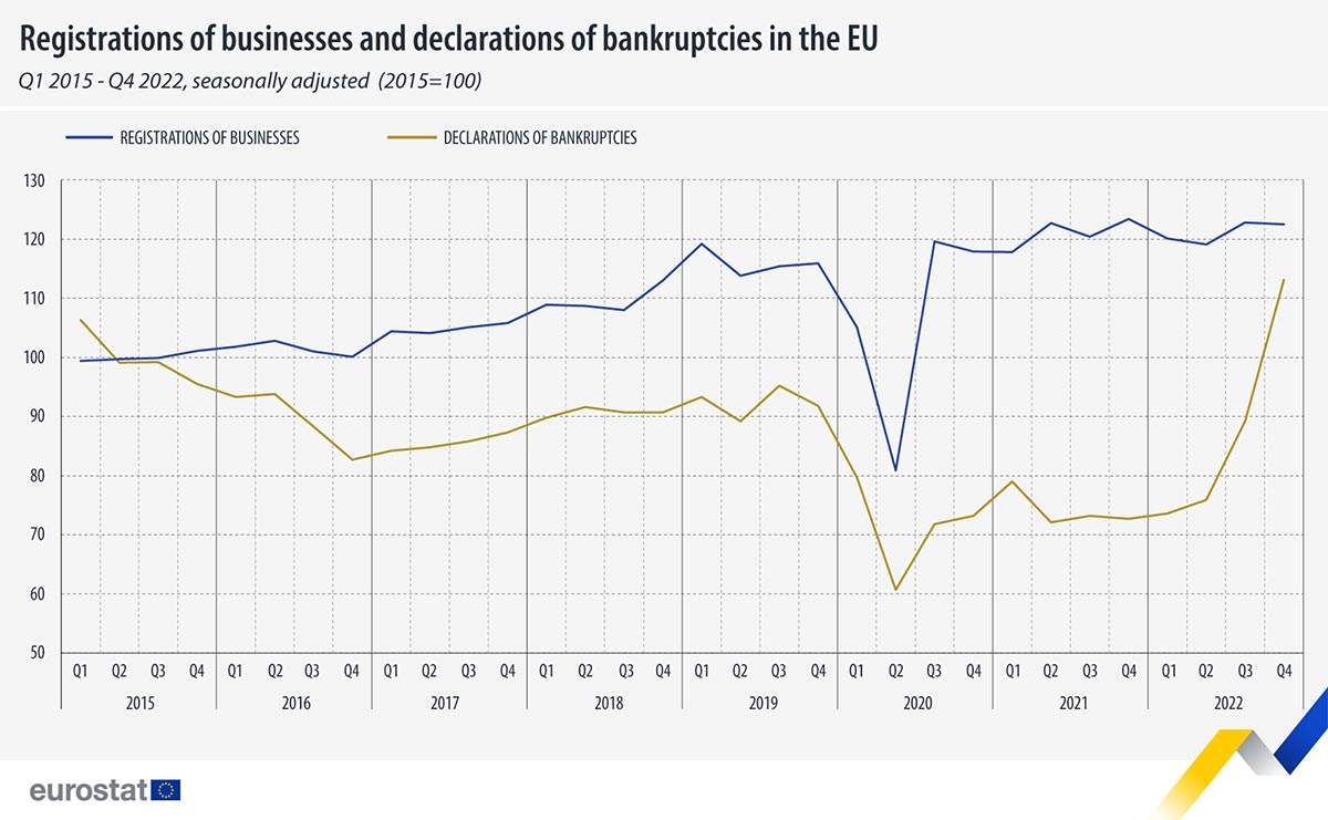 Un raport publicat de Eurostat a dezvăluit că falimentele în întreg blocul au crescut cu 26,8% față de trimestrul precedent, atingând cel mai mare nivel înregistrat.