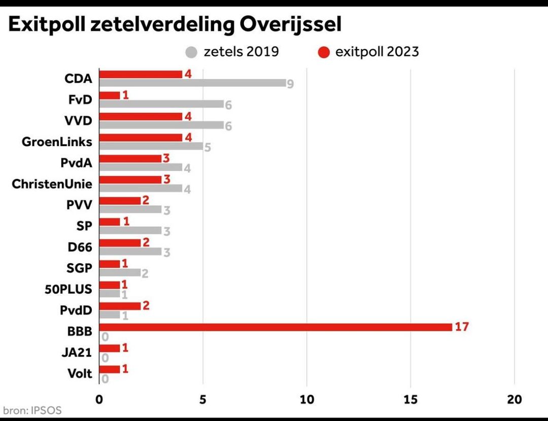 Cu 15 locuri, BBB a devenit cel mai mare partid din țară, la egalitate cu coaliția Partij van de Arbeid/GroenLinks (Partidul Muncitoresc/Stânga Verde), care a luat împreună 15 locuri. Partidul VVD al prim-ministrului olandez Mark Rutte a scăzut la 10 locuri (din 12).
