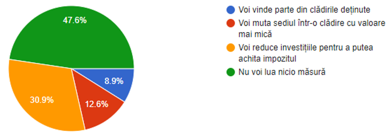 Ca urmare a creșterii impozitului pe clădiri raportat la grila notarială, 47,6% dintre intreprinzatori au indicat ca nu vor adopta nici o masura, 30,9% vor reduce investitiile pentru a achita impozitul, iar 12,6% se vor reloca intr-o cladire mai mica si 8,9% vor vinde bunurile immobile detinute.